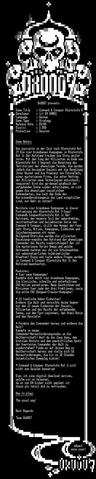 | FiLENAME: | Command and Conquer Alarmstufe Rot 3 - Der Aufstand GERMAN-0x0007.iso |