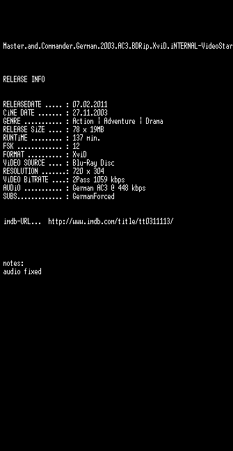 | FiLENAME: | Master.and.Commander.German.2003.AC3.BDRip.REPACK.XviD.iNTERNAL-VideoStar.avi |
