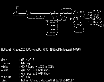 | FiLENAME: | A.Quiet.Place.2018.German.DL.AC3D.1080p.BluRay.x264-GSG9.mkv |