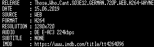 | FiLENAME: | Those.Who.Cant.S03E12.GERMAN.720P.WEB.H264-WAYNE.mkv |