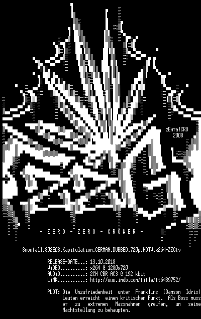 | FiLENAME: | Snowfall.S02E08.Kapitulation.GERMAN.DUBBED.720p.HDTV.x264-ZZGtv.mkv |