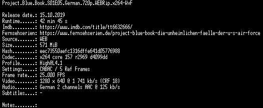 | FiLENAME: | Project.Blue.Book.S01E05.German.720p.WEBRip.x264-WvF.mkv |