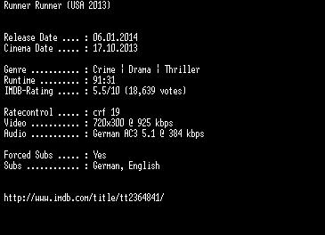 | FiLENAME: | Runner.Runner.German.BDRiP.x264-EXQUiSiTE.mkv |