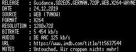 | FiLENAME: | Guidance.S02E05.GERMAN.720P.WEB.X264-WAYNE.mkv |