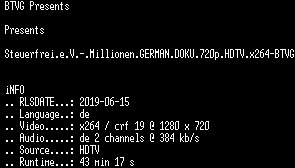 | FiLENAME: | Steuerfrei.e.V.-.Millionen.GERMAN.DOKU.720p.HDTV.x264-BTVG.mkv |
