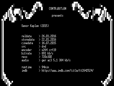 | FiLENAME: | Senor.Kaplan.2014.German.DVDRip.x264-CONTRiBUTiON.mkv |