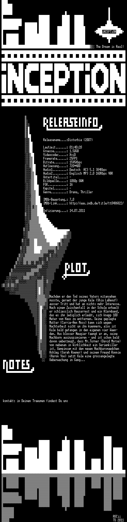 | FiLENAME: | Disturbia.2007.German.AC3.DL.HDRip.XviD-iNCEPTiON.avi |