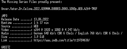 | FiLENAME: | Unser.Vater.Dr.Celine.2022.GERMAN.DUBBED.DOKU.1080p.WEB.h264-TMSF.mkv |