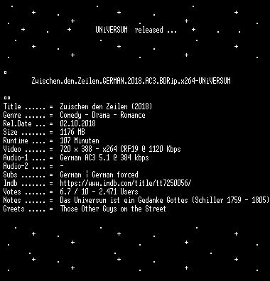 | FiLENAME: | Zwischen.den.Zeilen.GERMAN.2018.AC3.BDRip.x264-UNiVERSUM.mkv |