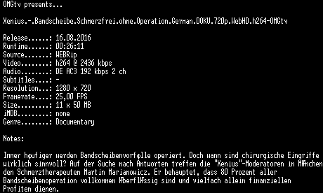 | FiLENAME: | Xenius.-.Bandscheibe.Schmerzfrei.ohne.Operation.German.DOKU.720p.WebHD.h264-OMGtv.mkv |