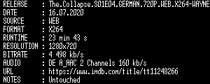 | FiLENAME: | The.Collapse.S01E04.GERMAN.720P.WEB.X264-WAYNE.mkv |
