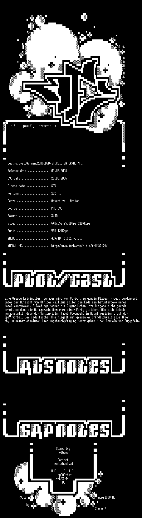 | FiLENAME: | See.no.Evil.German.2006.DVDRiP.XviD.iNTERNAL-MFi.avi |