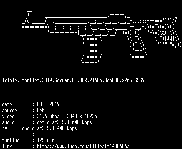 | FiLENAME: | Triple.Frontier.2019.German.DL.HDR.2160p.WebUHD.x265-GSG9.mkv |