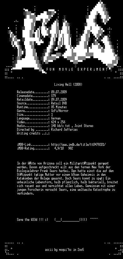 | FiLENAME: | Living.Hell.German.2008.DVDRiP.XviD-FmE.avi |