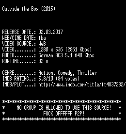 | FiLENAME: | Outside.the.Box.2015.German.720p.WebHD.x264-SLG.mkv |