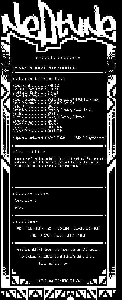 | FiLENAME: | Braindead.1992.INTERNAL.DVDRip.XviD-NEPTUNE.avi |