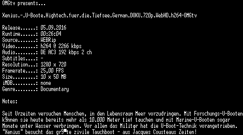 | FiLENAME: | Xenius.-.U-Boote.Hightech.fuer.die.Tiefsee.German.DOKU.720p.WebHD.h264-OMGtv.mkv |