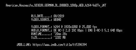 | FiLENAME: | American.Housewife.S03E08.GERMAN.DL.DUBBED.1080p.WEB.h264-VoDTv.mkv |