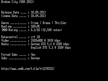| FiLENAME: | Broken.City.German.DL.1080p.BluRay.x264-EXQUiSiTE.mkv |