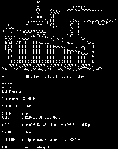 | FiLENAME: | ZeroZeroZero.S01E04.German.DL.DUBBED.720p.WEBRip.x264-AIDA.mkv |