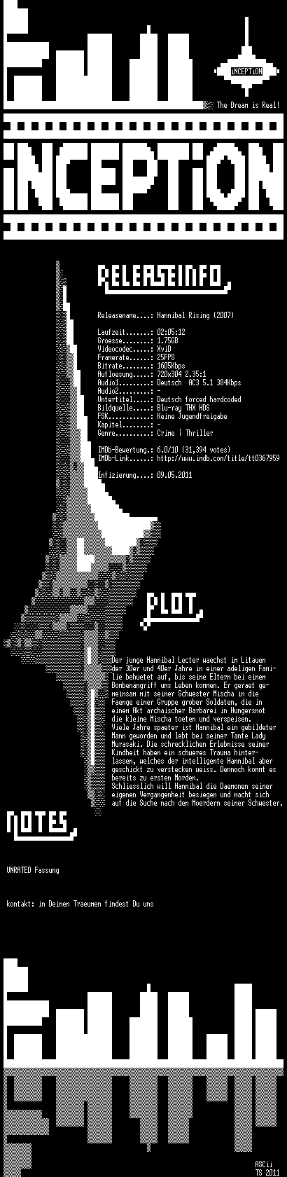 | FiLENAME: | Hannibal.Rising.UNRATED.2007.German.AC3.BDRip.XviD-iNCEPTiON.avi |