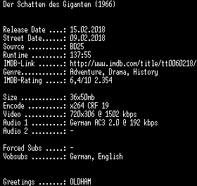 | FiLENAME: | Der.Schatten.des.Giganten.German.REMASTERED.1966.AC3.BDRip.x264-SPiCY.mkv |