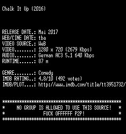 | FiLENAME: | Chalk.It.Up.2016.German.720p.WebHD.x264-SLG.mkv |