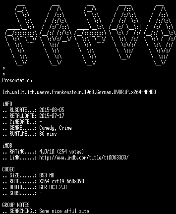 | FiLENAME: | Ich.wollt.ich.waere.Frankenstein.1968.German.DVDRiP.x264-NANDO.mkv |
