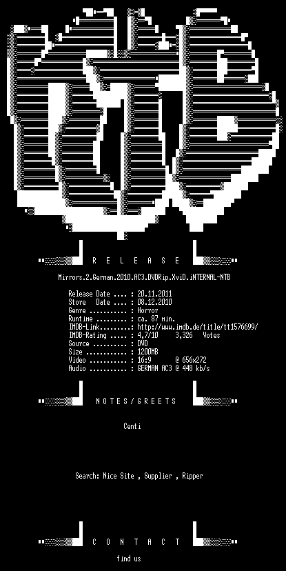 | FiLENAME: | Mirrors.2.German.2010.AC3.DVDRip.XviD.iNTERNAL-NTB.avi |