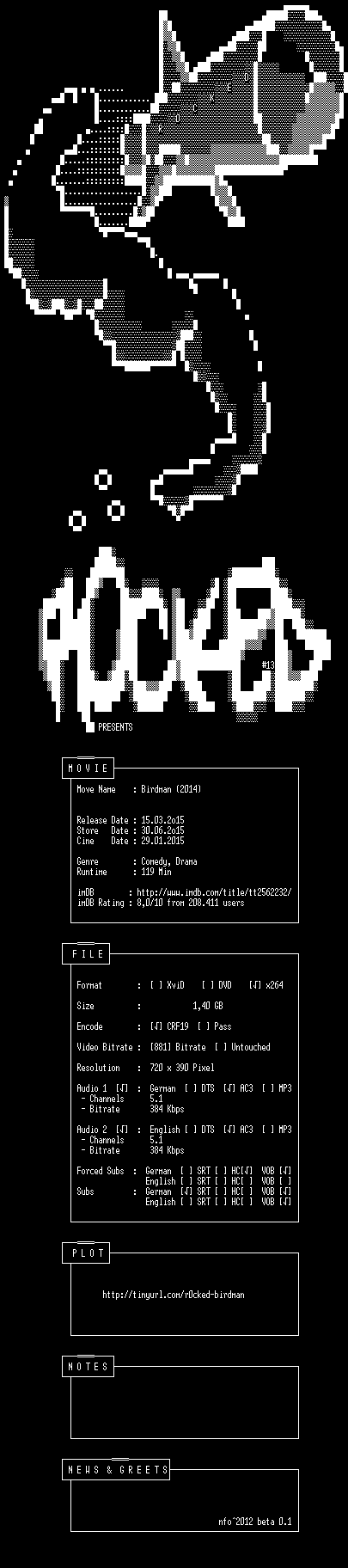 | FiLENAME: | Birdman.German.2014.DL.BDRiP.x264-R0CKED.mkv |