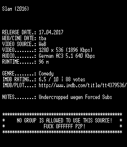 | FiLENAME: | Slam.2016.German.720p.WebHD.x264-SLG.mkv |