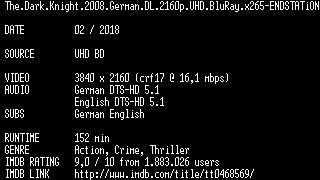 | FiLENAME: | The.Dark.Knight.2008.German.DL.2160p.UHD.BluRay.x265-ENDSTATiON.mkv |
