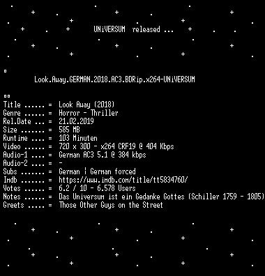 | FiLENAME: | Look.Away.GERMAN.2018.AC3.BDRip.x264-UNiVERSUM.mkv |