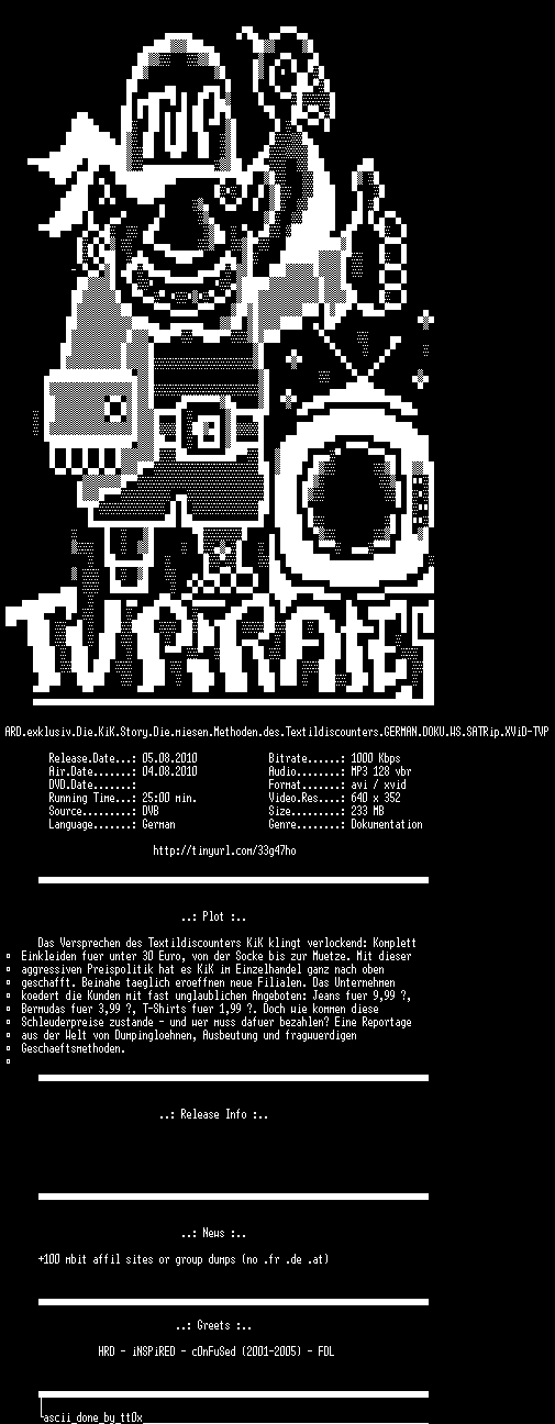 | FiLENAME: | ARD.exklusiv.Die.KiK.Story.Die.miesen.Methoden.des.Textildiscounters.GERMAN.DOKU.WS.SATRip.XViD-TVP.avi |