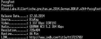 | FiLENAME: | Blood.Lake.Killerfische.greifen.an.2014.German.BDRiP.x264-PussyFoot.mkv |