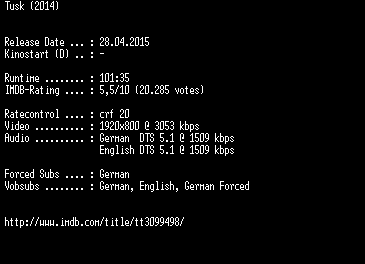 | FiLENAME: | Tusk.2014.German.DL.1080p.BluRay.x264-EXQUiSiTE.mkv |
