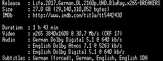 | FiLENAME: | Life.2017.German.DL.2160p.UHD.BluRay.x265-BREAKERS.mkv |