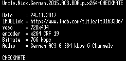 | FiLENAME: | Uncle.Nick.German.2015.AC3.BDRip.x264-CHECKMATE.mkv |