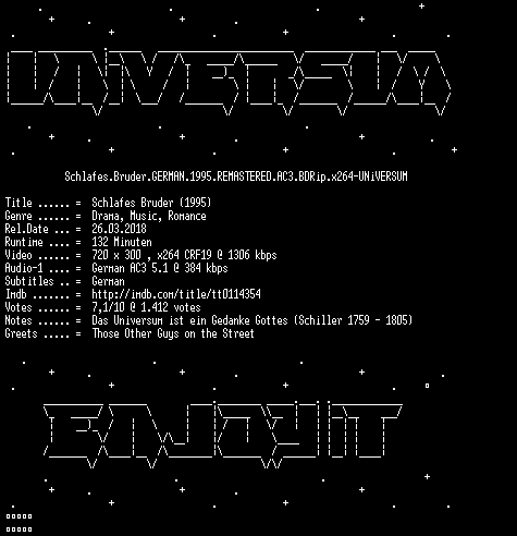 | FiLENAME: | Schlafes.Bruder.GERMAN.1995.REMASTERED.AC3.BDRip.x264-UNiVERSUM.mkv |