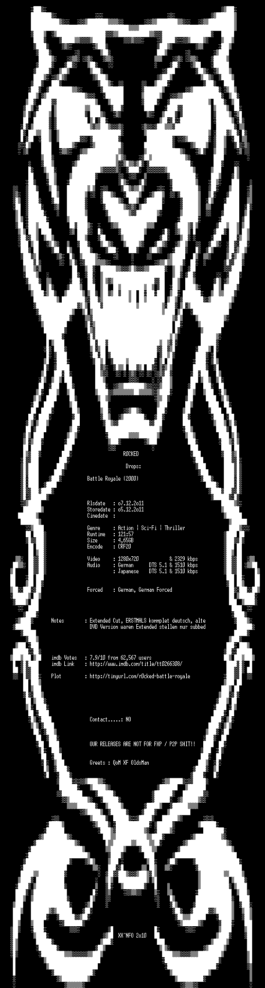 | FiLENAME: | Battle.Royale.Extended.Cut.2000.German.DL.DTS.720p.BluRay.x264-R0CKED.mkv |