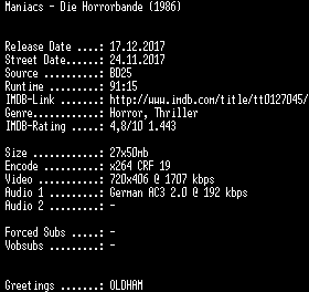 | FiLENAME: | Maniacs.Die.Horrorbande.German.REMASTERED.1986.AC3.BDRip.x264-SPiCY.mkv |