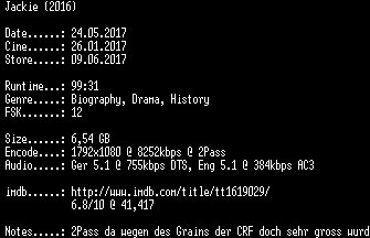 | FiLENAME: | Jackie.Die.First.Lady.2016.German.DL.1080p.BluRay.x264-CiNEViSiON.mkv |