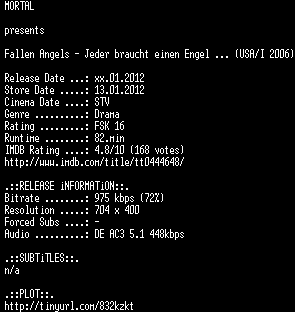 | FiLENAME: | Fallen.Angels.2006.German.AC3.DVDRip.XviD-MORTAL.avi |