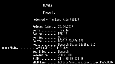 | FiLENAME: | Motorrad.The.Last.Ride.German.2017.BDRiP.x264-MOViEiT.mkv |