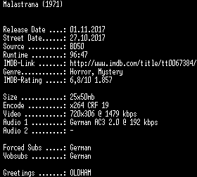 | FiLENAME: | Malastrana.German.REMASTERED.1971.AC3.BDRip.x264-SPiCY.mkv |