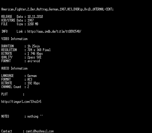 | FiLENAME: | American.Fighter.2.Der.Auftrag.German.1987.AC3.DVDRip.XviD.iNTERNAL-CENTi.avi |