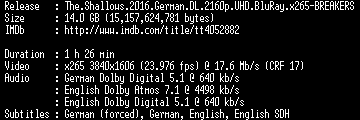 | FiLENAME: | The.Shallows.2016.German.DL.2160p.UHD.BluRay.x265-BREAKERS.mkv |