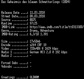 | FiLENAME: | Das.Geheimnis.des.blauen.Schmetterlings.German.REMASTERED.2004.AC3.BDRip.x264-SPiCY.mkv |