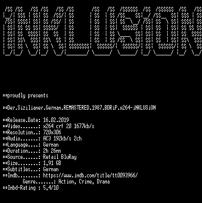 | FiLENAME: | Der.Sizilianer.German.REMASTERED.1987.BDRiP.x264-iNKLUSiON.mkv |