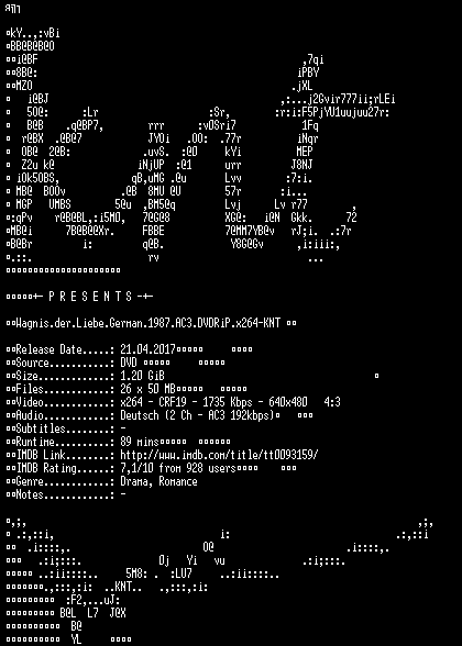 | FiLENAME: | Wagnis.der.Liebe.German.1987.AC3.DVDRiP.x264-KNT.mkv |